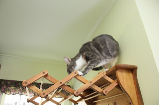 Athena does not attempt any of the laundry room shelves, but she was happy enough to try out a ladder when Brian was changing a light bulb.