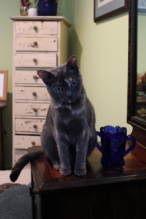 She stands guard outside my bedroom and bolts into the room when I open the door, making a beeline for my grandmother’s antique dressing table. She jumps up and peers into a cobalt blue vase, looking for The Precious.