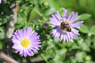 | I admit, I’m not great at bee identification, so I’m not sure of the species here. This creature visited in the early morning, casting his shadow in one of my fall-blooming asters. |