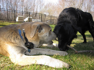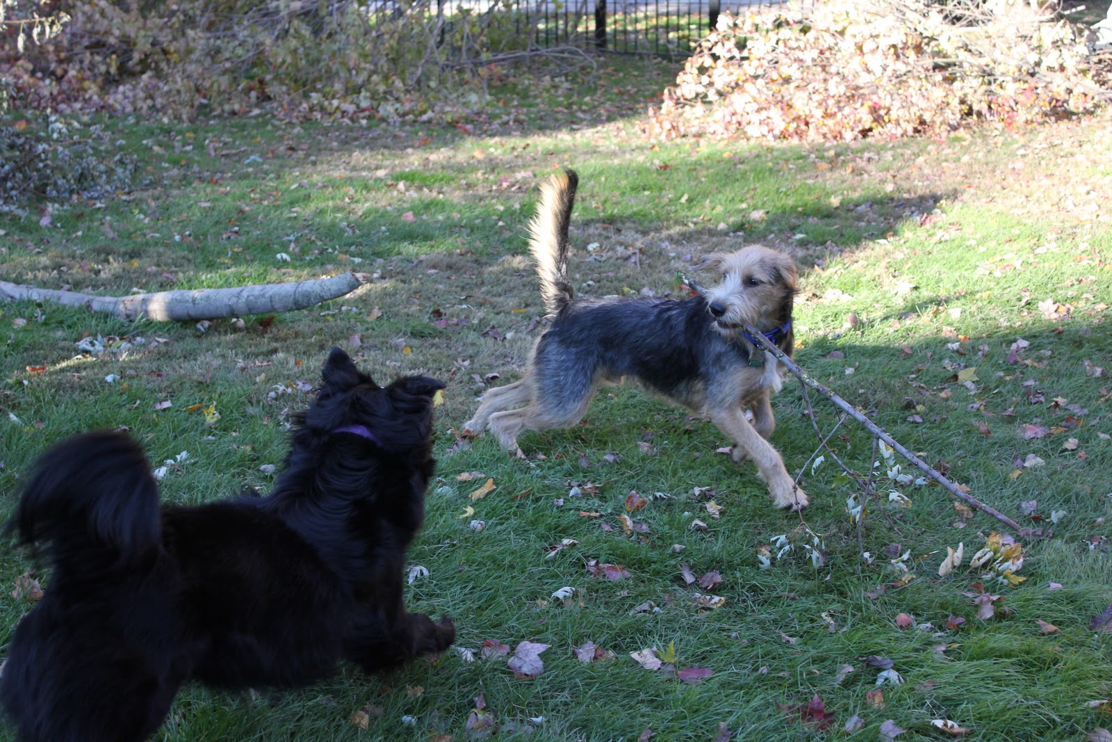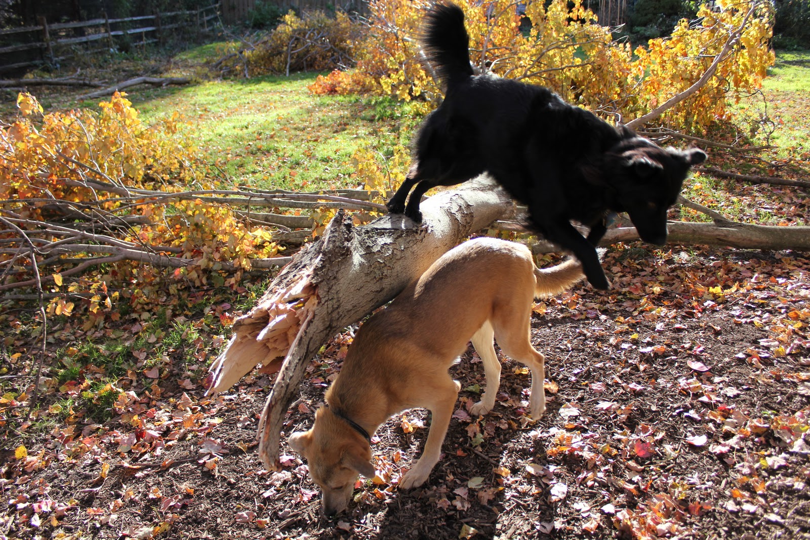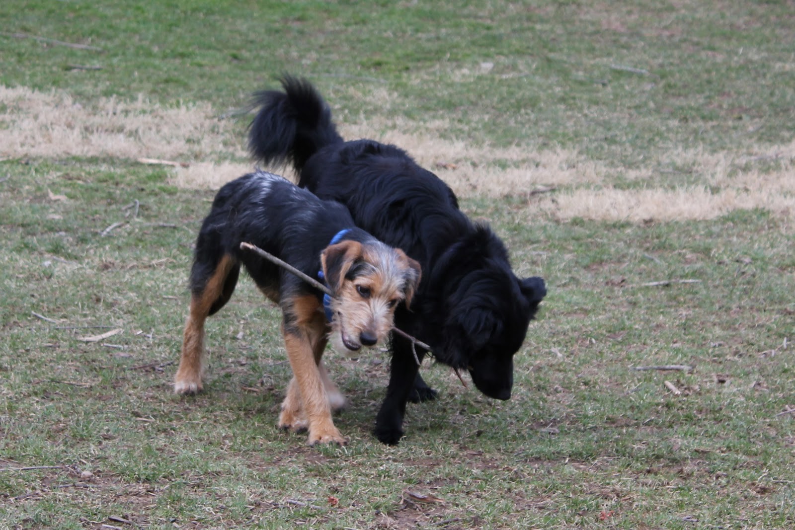 | Tucker and Jasper discuss ownership of a bark. I believe they both own pretty impressive barks. |