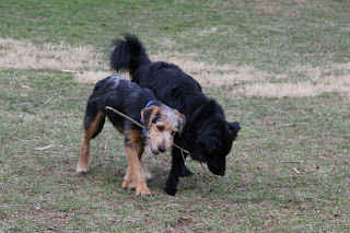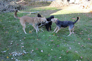 | Tucker and Jasper companionably share a multi-branched stick. |