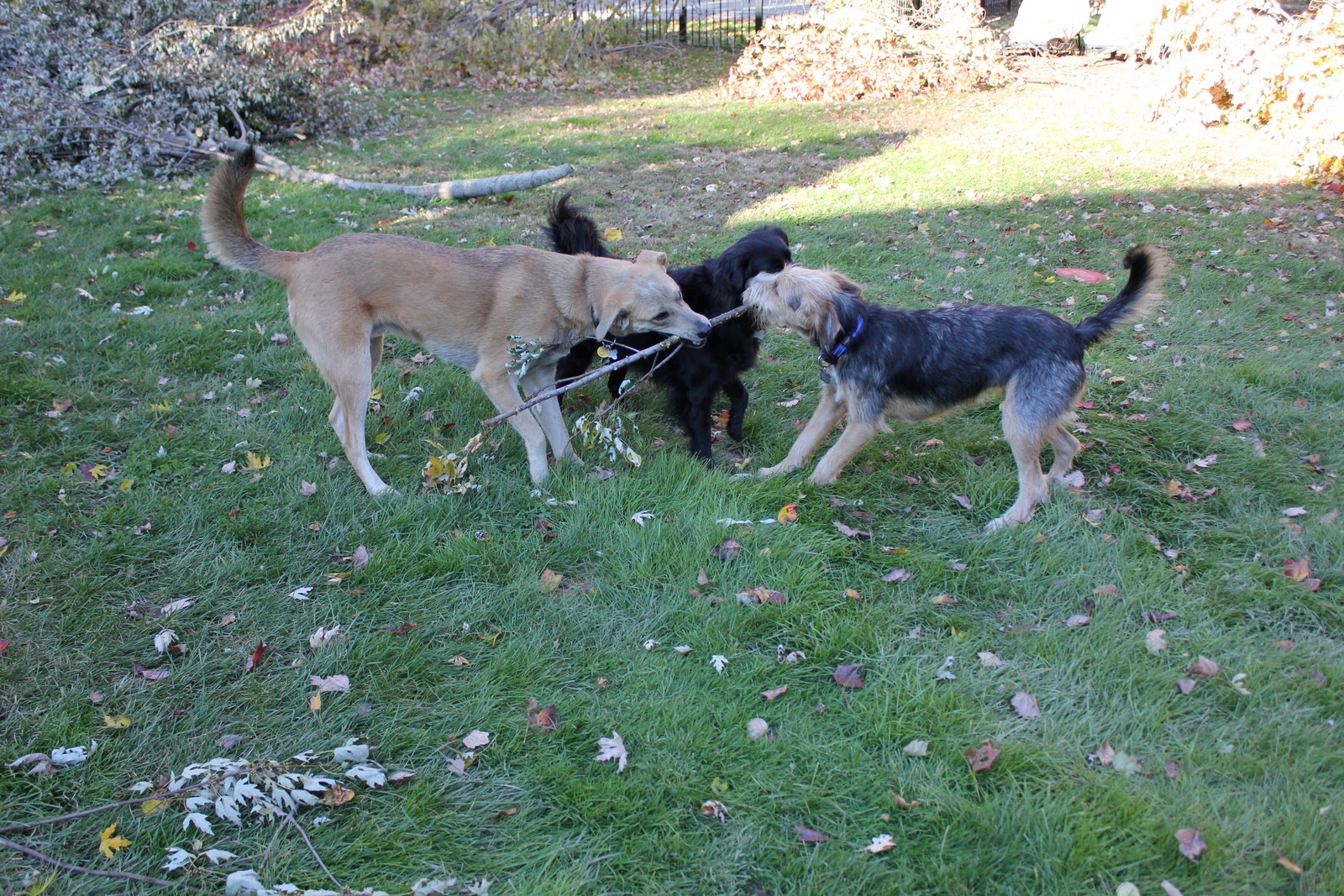 Even three dogs can sometimes share one stick. That usually doesn’t last long, as someone will eventually claim it as his or hers.