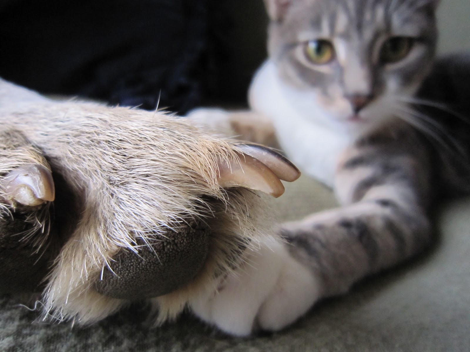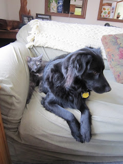At first the dogs galloped back and forth to each gate, sending the kittens scampering for cover under the buffet. Jasper and Lilah were given the Down command, and were rewarded for responding, as well as when they relaxed or looked away from the cats. At night, when the dogs went to our bedroom with us, my kids let the cats have the run of the house, so Dawn and Athena could familiarize themselves with the best hidey spots and be comfortable outside of the dining room.