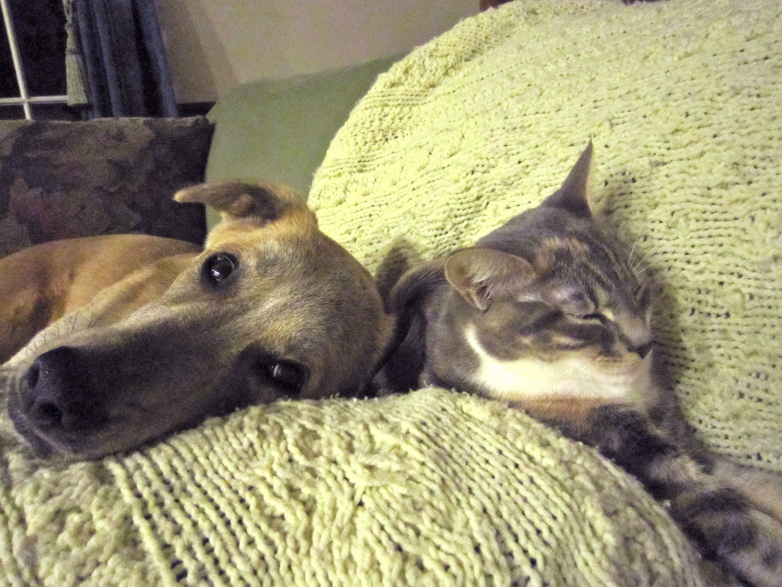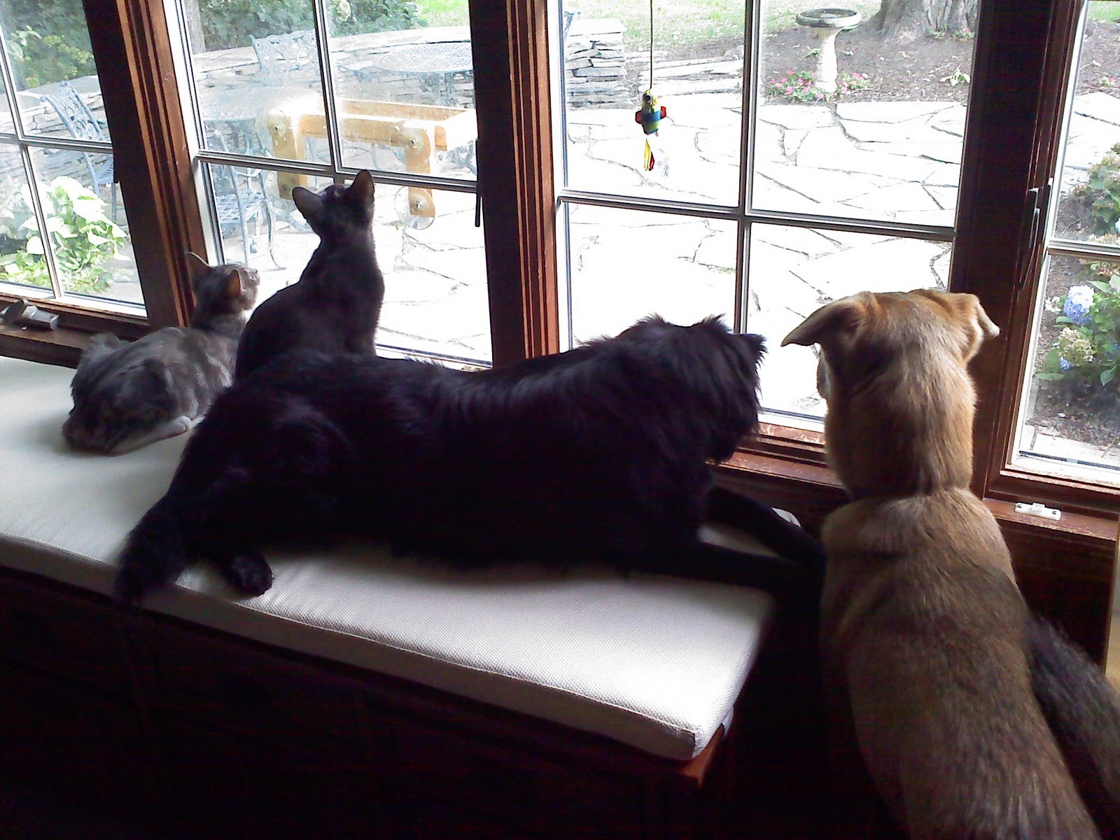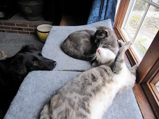 Today, cats and dogs are living in…well, if it’s not harmony, then it’s pretty close. The cats nuzzle and rub up against the dogs. I’ve even heard Dawn purr when she cozies up to Jasper or Lilah. Kitty Crazies take place as always, with Athena leaping over Lilah and Dawn flying past Jasper, mere inches from his nose. They all share an interest in Watching Birdies, and it is sometimes a group activity.