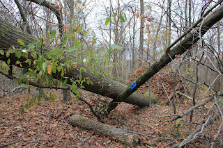| The park behind our house had paths with markers on the trees. Here, the blue trail (notice the blue marker on one of the fallen trunks) is blocked by fallen trees. |