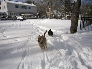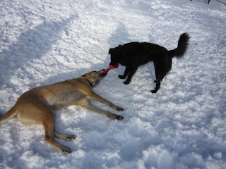Run. And Run. And Run Some More: Simply because you can do it. In the snow, it might look more like leaping, bounding and plowing, but the effect is the same. And Running often turns into Chasing and Biting. Lilah goes for the easiest target: Jasper’s legs. And Jasper just likes to channel his inner hockey player with serious body checks to throw Lilah to the ground. Which often leads to Snow Wrestling (see below.)